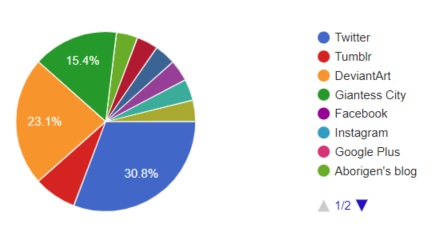Who responded? The pie chart generated by Google Forms shows 20 writers and six readers spoke up this time. Most people learned about Size Riot from Twitter, slightly fewer from DeviantArt and Giantess City. The rest was Tumblr (RIP), Facebook, Instagram, Google Plus (amazingly), my blog, and word of mouth. One person even said they heard about it at SizeCon and followed up here! That’s fantastic.