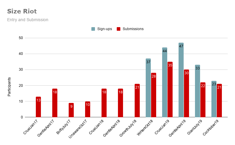 As you see, I didn’t start counting how many people signed up until October 2018. In the beginning of the contest, I have no records whatsoever of who might have signed up: people must’ve been telling me directly or something. But now we can see that, at the most, one-third of people who sign up for the contest will find themselves unable to submit a story. This may be because life gets in the way, tragedy strikes, future schedules fill up, or even just a profound absence of the muse. It happens to us all, at one time or another, no one should feel bad about that.