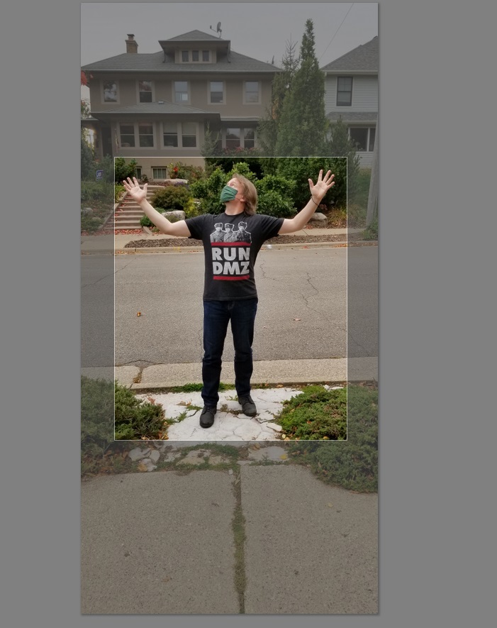 There’s that isolated image of you on the background, but it’s probably at the wrong scale entirely. With your self-image layer selected, grab the corner of your image and scale it roughly how you want it. Don’t worry, it will preserve the proportions.