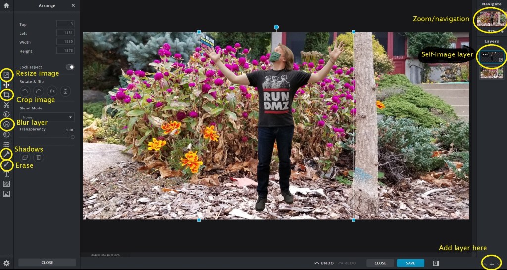 Once you’ve got yourself sized appropriately, zoom in to the image (Navigate, upper right) and enlarge yourself in your surroundings. The two tools you’re going to use now on the left-hand toolbar are Drawing (for the Erase function) and Retouch (for the Dodge/Burn function). On the right-hand toolbar, where your self-image is still highlighted, you’ll notice a menu button of three lateral dots, called a “kebab” (or just right-click on the layer). Click that, and now you can make your layer transparent. This is handy for when you want to position objects in front of you, to perpetuate the illusion that you’re really there and interacting in your environment.