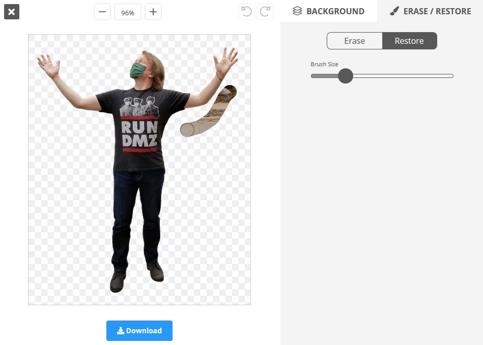 See what the Restore function’s doing there? It’s really easy to use, except the edges are too crisp, if you’re erasing extra artifacts around yourself. That will stand out because the edges around the image will be just slightly blurry, which is great for setting you into your background, but a crisp edge means more work later. Start with a well-lit image and an uncomplicated background, and RemoveBG will serve you well.