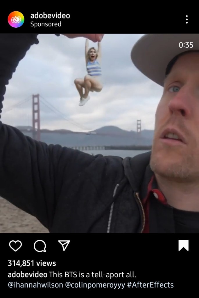 This is Adobe’s ad for video collage work, made simple by their tool. The video ad runs through the process of filming the woman model before a greenscreen, tracking where the giant hand will drag her through the video, and other techniques. The point is that Adobe wants you to know how easy it is to create something pretty good-looking like this.