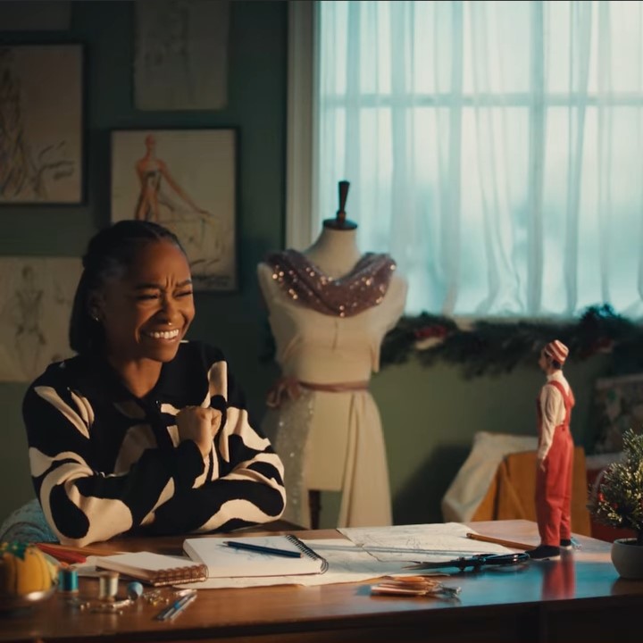 In this ad, a clothing designer is suffering creative block, and a tiny elf shows up to take her to a runway fashion show. Is that his biker jacket hanging on the chair back?