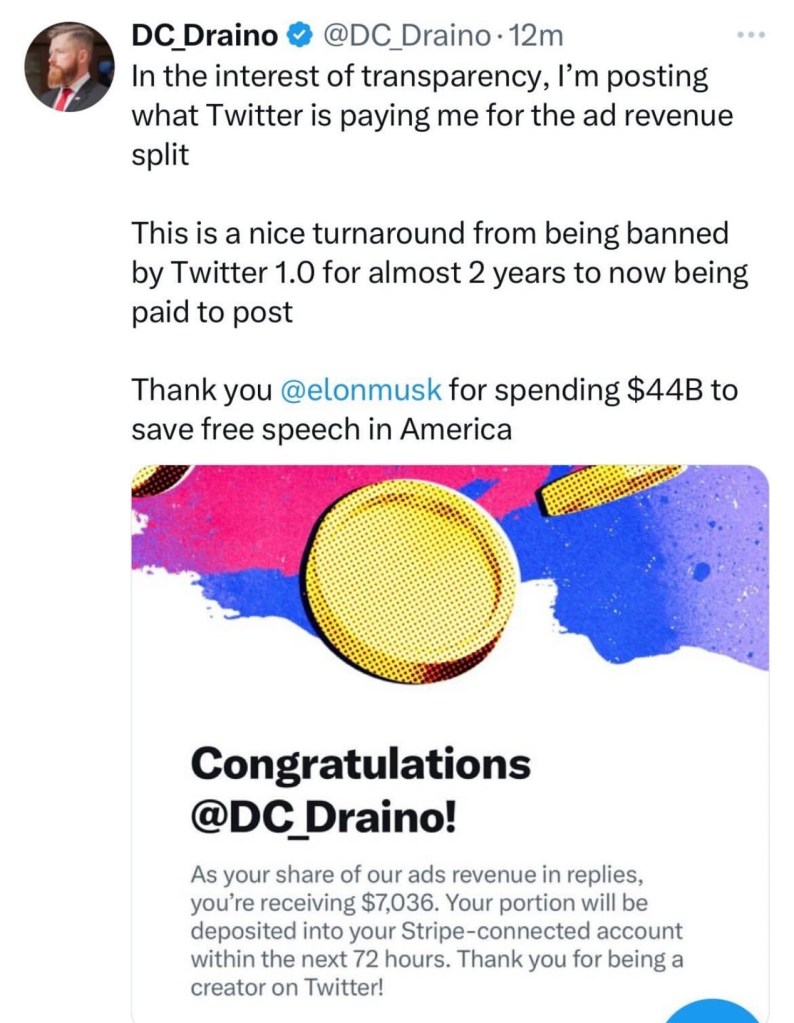As we all know, Musk opened the doors to hate speech and bigots, and O’Handley has thanked him for $7,036 in ad revenue. As you can see in Twitter’s congratulations to him, Stripe facilitated this financial transaction.